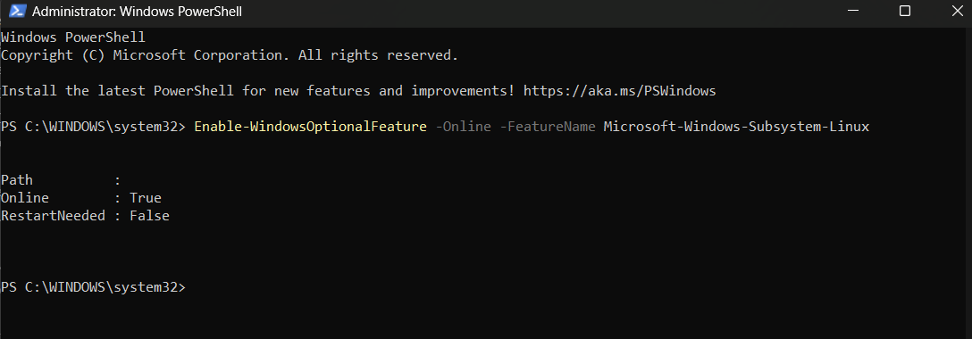 langkah pertama, kamu harus mengaktifkan fitur microsoft windows subsytem for linux terlebih dahulu dengan syntax atau command berikut pada powershell windowsmu