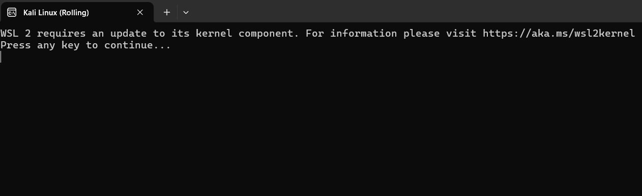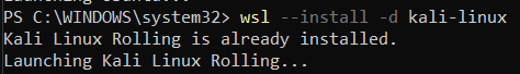 Setelah itu, gunakan command berikut untuk menginstall distro kali linux dan wsl di komputermu, karena disini saya sudah menginstall, maka muncul tampilan seperti ini